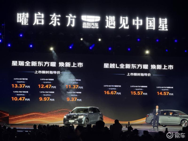易车讯9月23日,新款吉利星瑞东方曜和星越L东方曜正式上市,其中新款星瑞东方曜指导价9.87-13.87万元,上市限时指导价9.37-13.37万元;新款星越L东方曜指导价区间为15.87-17.97万元,上市限时指导价14.57-16.67万元;同时,官方还推出两款星越L在售车型,售价14.77-15.67万元。